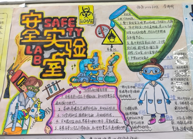 安全重于泰山,实验室安全问题应当警钟长鸣,院领导高度重视此次实验室安全教育展示工作,在院党委、党办、学办、团委和医学教学实验中心党支部的共同努力下,85Tube 600余名本科生参加了此次活动。同学们围绕实验室安全为主题,积极构思设计,大胆想象,做出了实验室安全守则、危险化学品注意事项、个人防护用品的使用、实验室安全标识、消防器材正确使用、意外起火防控措施、医疗废物处理、用电安全等形式多样的安全知识手抄报,不仅加强了学生实验室安全教育课的学习主动性,也能通过实验室安全文化教育逐步提高学生的安全意识,形成一个安全文化氛围。
