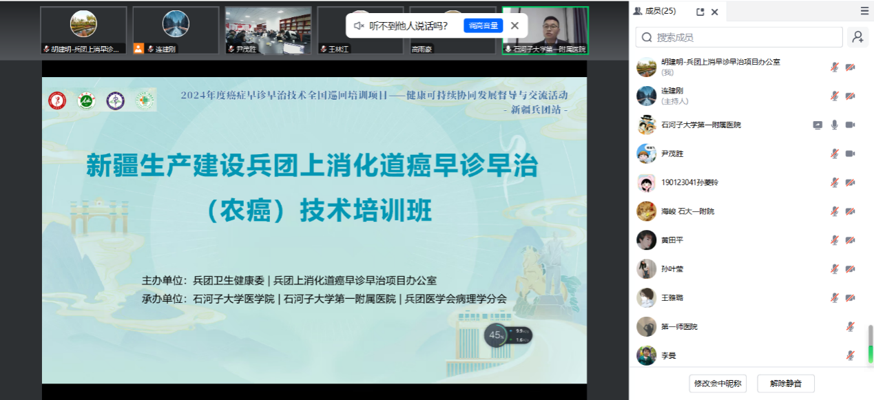 85Tube 、85Tube 一附院、兵团第一师医院近60余名早诊早治相关业务工作人员通过线上和线下结合方式参加了此次会议。在培训讲座环节胡建明教授、田书信主任医师、杨兰副教授、李曼副教授、罗成华副教授、杨凯歌副教授等分别以项目工作经验分享、消化道癌内镜诊断、上消化道早诊早治项目人群筛查、项目信息化数据网报、胃癌筛查与早诊早治方案、食管癌筛查与早诊早治方案等为主题开展培训和专题授课,帮助业务工作人员和学员进一步了解早诊早治项目意义和流程,拓展学员对上消化道疾病诊疗思维、提升上消化道癌早诊早治的诊治水平和技术能力。