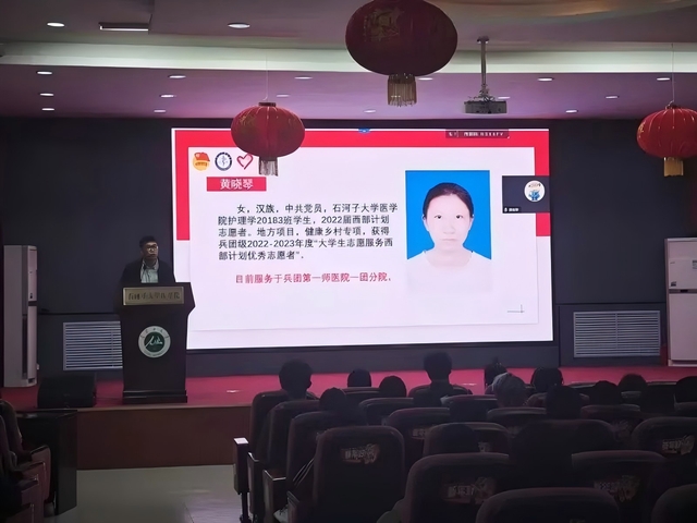 为做好大学生志愿服务西部计划宣传动员工作,号召更多的石医学子积极深入基层,服务西部,并帮助同学们了解相关政策、做好相关准备,429日学院团委于南区学术报告厅举办大学生志愿服务“西部计划”宣讲会。此次活动邀请了兵团2022-2023年度“大学生志愿服务西部计划优秀志愿者”黄晓琴进行西部计划工作分享,学院团委书记肖盛中老师进行相关政策讲解,共计200余名学生参加了此次宣讲活动。