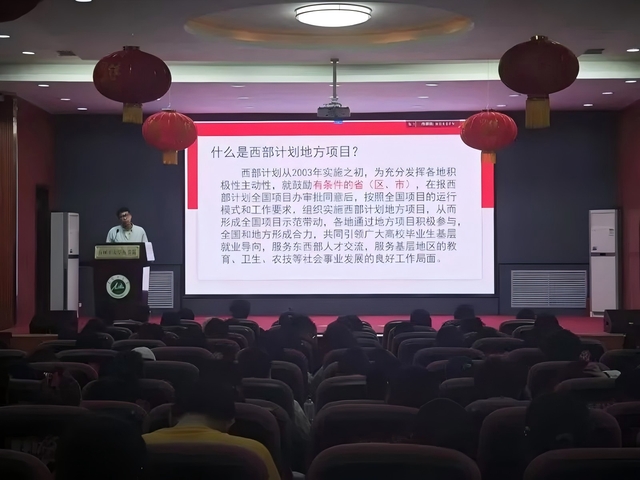 会议伊始,由优秀志愿者代表黄晓琴进行经验分享,她以自身西部计划工作经历为切入点展开,青春是尝试,是突破,是跨越,她鼓励同学们积极在不同的工作环境中锻炼自己,提升适应能力和学习能力,同时结识志同道合的朋友;随后,她详细介绍了作为一名“西部计划”志愿者的工作日常,包括为什么加入西部计划、在西部计划中负责什么、日常生活和西部计划有哪些作用及收获等四个方面;最后,她总结收获与感悟,并为同学们提供了关于未来择业的建议,她说道,加入西部计划这件事,对于迷茫的应届毕业生来说,不仅是一次宝贵的工作经历,更是一次对个人职业规划和人生观的深刻影响。
