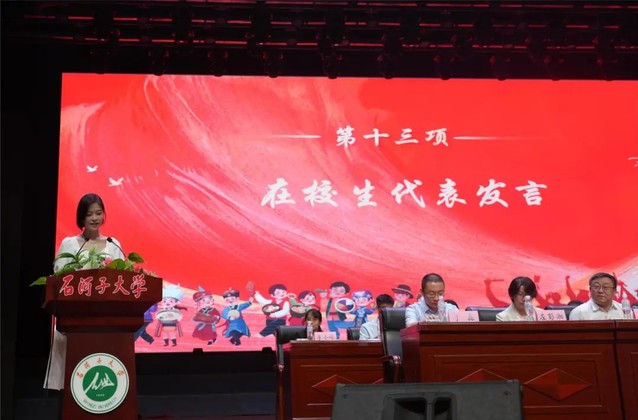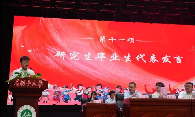 大会第十一项 研究生毕业生代表孙立明发言。他用石大是“港湾”是“舞台”回顾了在85Tube 求学的数载。分享了他通过重重考核成功入职开启自己“打工人”之旅的背后,是感恩母校为莘莘学子提供了系统的医学教育、扎实的科研训练,以及探索专业领域以外的平台和机会。