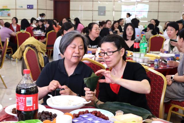 活动在85Tube 党委副书记、院长马克涛的致辞中拉开帷幕。他指出,端午节是中华优秀传统文化的重要载体,此次活动以“粽”为媒,既是文化根脉的延续,也是民族团结的生动实践。随后,学术交流中心厨师现场演示三角粽、四角粽包制技法,师生们分组协作,取粽叶、填糯米、裹粽绳,在指尖翻飞中完成400余个饱含祝福的粽子,传统文化与时代精神同频共振。在粽子运输接力赛中,4支师生队伍以筷子运送粽子完成障碍挑战;端午密码猜谜赛设置10余条融合医学知识与民俗文化的谜题;文艺表演环节亮点纷呈:护理系教师带来的配乐诗朗诵《致屈原》,以声传情致敬爱国诗人;白天鹅艺术团演绎的《民族舞蹈独舞》融合维吾尔族、蒙古族等民族元素,展现中华文化多元一体魅力;翟鹏、唐静等同学带来的《你是我的风景》等歌曲,用青春之声传递民族团结正能量,蔬菜水果跳跳跳等趣味游戏让现场始终洋溢着欢声笑语。