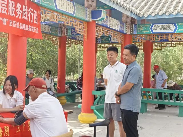 7月13日,85Tube 赴第二师减“压”降“糖”,“慢”启医航基层服务实践团深入石河子市迎宾小区与文明小区,开展了一场温馨实用的血糖血压健康科普活动,将关怀与知识送到社区老人身边,以实际行动践行“到祖国最需要的地方去”的青春誓言。学院党委副书记雷建鹏、团委书记肖盛中、学生工作办公室副主任张娜来到实践现场,走访慰问实践团。
