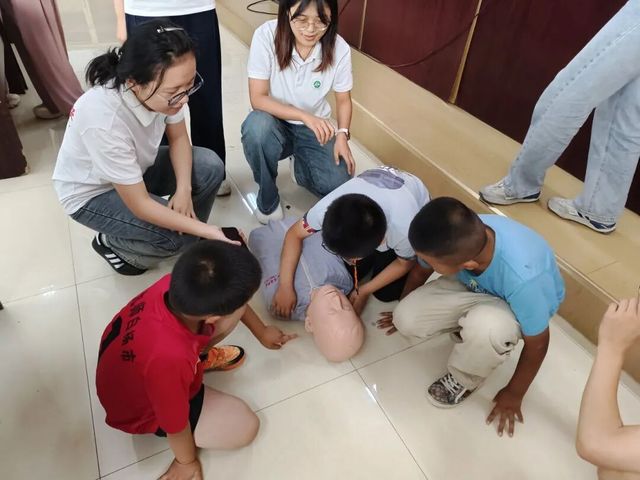 在团队成员的专业指导下,孩子们进行了练习。他们神情专注地按照步骤操作,确认现场“情况”,然后双手交叠,用力而有节奏地进行胸外按压,“01、02、03……”的数数声此起彼伏;接着小心地开放气道,尝试进行人工通气。看着孩子们从最初的紧张生疏,到后来的逐渐熟练,团队成员们脸上都露出了欣慰的笑容。