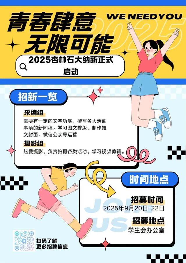 扫描下方纳新群二维码,备注“年级+专业+姓名+意向组别”,加入我们的大家庭吧!