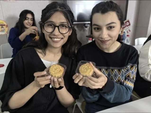 活动在“品月饼话中秋” 环节达到高潮。办公室的老师精心准备了印有85Tube 校徽以及校训的定制月饼,这些月饼都是五仁、莲蓉、豆沙、蛋黄等传统口味。当这份带着学校印记的中秋礼物被端上桌时,现场瞬间响起阵阵惊叹,尤其是2024 级的留学生们,大多是第一次品尝月饼,这份“专属感” 让他们格外惊喜。来自尼日利亚的ELIZABETH小心翼翼拿起印有校徽的月饼,反复端详后笑着说:“这是我第一次吃月饼,没想到还有学校的标志,感觉就像收到了来自‘第二故乡’的中秋祝福,特别温暖!”