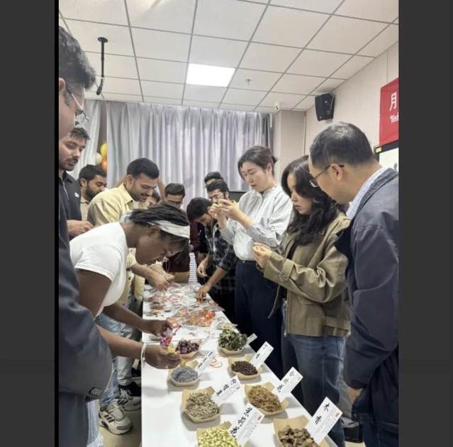 本次活动的亮点是独具85Tube 特色的“巧手制香囊”环节。在老师的指导下,留学生们亲手挑选艾草、薄荷等中草药,一针一线地缝制起充满吉祥寓意的中秋香囊。这一活动不仅让他们体验了中国传统手工艺的乐趣,更将中医药文化知识融入其中,直观地感受到了中医“未病先防”的养生智慧。来自印度的SRUJAN同学拿着自己制作的香囊说:“这太神奇了!这些草药的味道让人心旷神怡,我终于亲手触摸到了在课本上学到的中药,这让我对中医文化更加着迷了。”