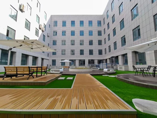 杏三楼的庭院,是校园里一抹清新亮色。这里绿草如毡,木质步道与平台交错延伸,搭配着休闲桌椅和遮阳伞,构成了舒适自在的休憩场景。课间时分,学生们可在此短暂停歇,或与同窗畅谈,或于书海中徜徉,在自然氛围中舒缓身心,为后续学习积蓄能量。无论是春日暖阳下的悠然,还是秋日微风中的惬意,杏三楼庭院都能让学生们在与自然的亲近中,寻得内心的宁静与放松。