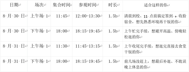按你方便的场次,提前 10 分钟到集合点,找学长签到就能加入队伍~想和室友、同班同学一起?约好同一场次,组队逛更开心!