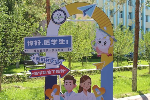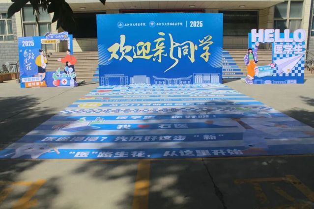 路上的迎新标志藏着巧思:路灯杆上挂着“欢迎新同学”的彩带,转角处立着各学院的卡通形象立牌,地面的箭头贴纸印着“报道这边走”“社团在前方”。连路边的标语都带着温度——“从这里开始,让医学梦想发芽”“新的旅程,等你出发”,一步一景,都在悄悄说“欢迎回家”。