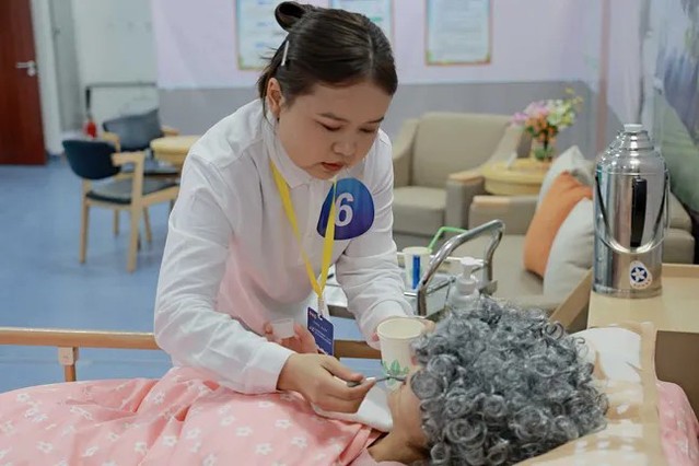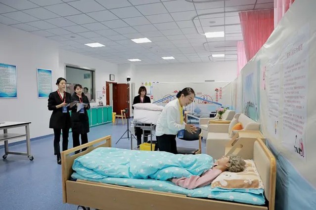 本次竞赛严格对标《养老护理员国家职业技能标准》及国家级赛事规范,设置理论知识考核与综合实操技能两大环节。理论考试采用职业能力测评方式命题,重点考查选手的知识运用能力、综合分析与实际问题解决能力。实操技能竞赛涵盖生活照护、基础照护、康复服务、心理支持四大职业功能模块,并分别设定居家、社区、机构三类典型场景。竞赛过程中,要求选手将照护评估、安全照护、人文关怀、感染防护、健康教育以及职业安全与保护等要素全面融入养老照护服务全流程,综合检验选手的照护计划制定、实际操作水平、沟通交流能力、人文关怀素养及安全照护意识等综合素质。