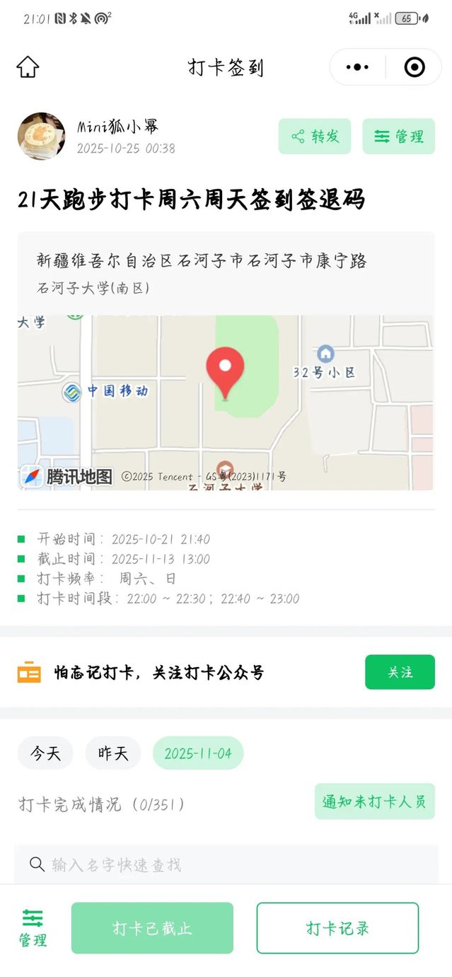 通过QQ推文、微信公众号、辅导员联动推广等多渠道宣传,活动吸引351名学生报名,其中25级新生参与占比达42%。21天内,微信小程序累计签到签退6829人次,有效打卡率85%,58人斩获“跑步之星”、126人获评“坚持之星”,QQ空间相关话题曝光超1.2万次,形成校园自发传播热潮。