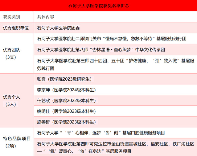 此次多项表彰的获得,是对85Tube “理论与实践相结合、人才培养与服务社会相统一”育人模式的充分肯定。未来,85Tube 将继续深化实践育人内涵,引导更多医学生把论文写在祖国大地上,把服务送到基层最需要的地方,以青春之力助力健康兵团、健康中国建设,让青春在火热实践中绽放绚丽之花。