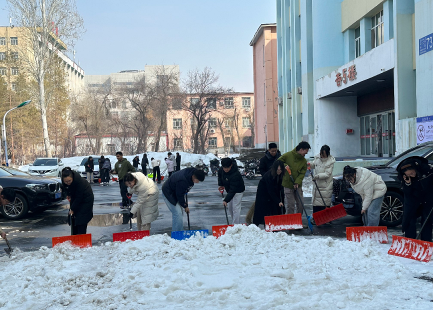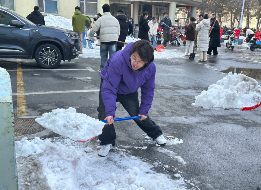 活动现场,党员同志们热情高涨、分工协作,迅速投入到志愿服务中。大家手持扫雪铲、铁锹等工具,认真清理路面残雪,铲除结冰路段,全力消除师生出行安全隐患,确保校园道路安全畅通。针对非机动车停放杂乱问题,党员们耐心将乱停乱放的自行车、电动车逐一搬移、规范摆放,引导车辆有序归位,让停车区域整齐划一、通行顺畅。寒风中,党员同志们不畏低温、干劲十足,用汗水清扫出洁净安全的校园环境,用行动擦亮党员身份。