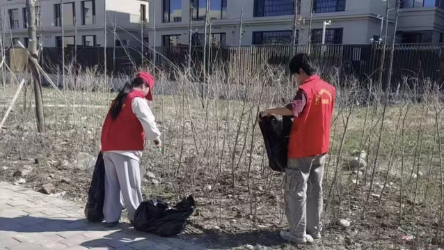 活动中,6名队员化身社区环境守护者,手持垃圾钳、垃圾袋,深入33小区各个角落,开展融雪性垃圾专项清理。队员们不畏初春微凉,分工协作、干劲十足,沿着小区道路、绿化带、楼前楼后仔细排查,将积雪融化后露出的塑料袋、烟头、枯枝杂物等逐一捡拾干净,不放过任何一处卫生死角。弯腰、捡拾、装袋,一个个忙碌的身影穿梭在小区里,成为春日社区中一道温暖又亮眼的青春风景线。